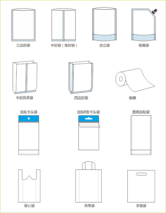 PET, OPP, CPP, CPE, AL, vmCPP,vmPET PA(尼龍)等.